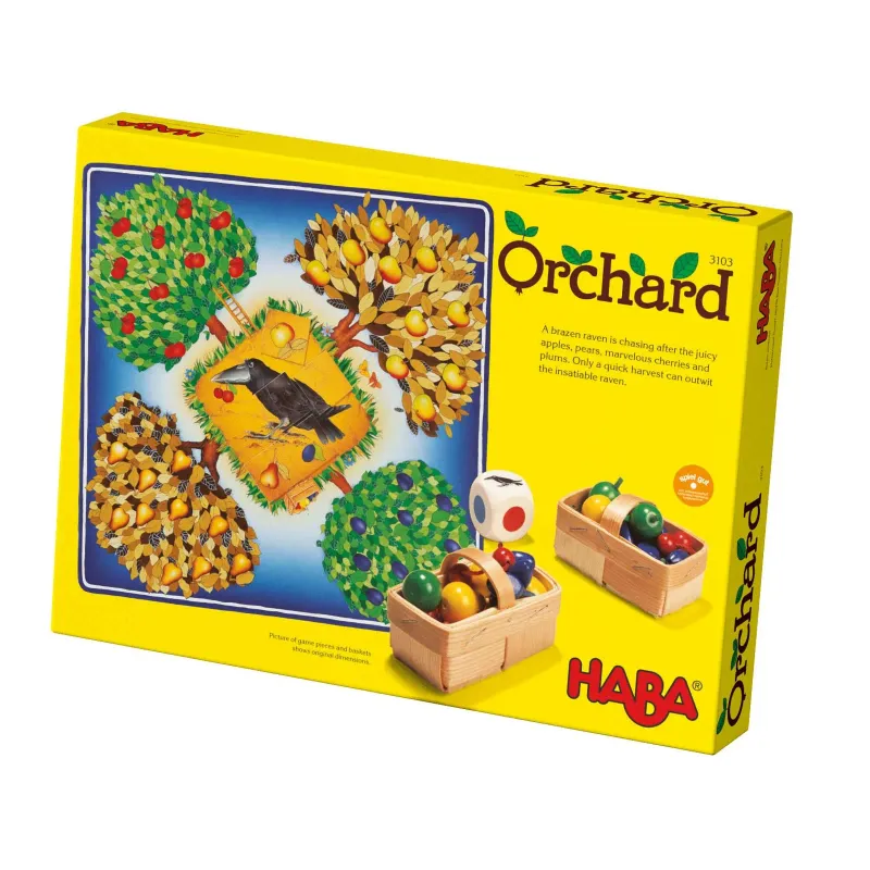 Edukativna igra Orchard podstiče koperaciju među igračima, unapređuje veštinu prepoznavanja boja i oblika i pomaže deci u usavršavanju motoričkih sposobnosti. Kako bi igrali, treba da bacate velike drvene kocke i saznate hoćete li ubrati voće ili deo puzle gavrana. Ako igrači sarađuju i napune 4 male korpice sa raznobojnim voćem pre nego što sklope puzlu gavrana svi su pobedili!
