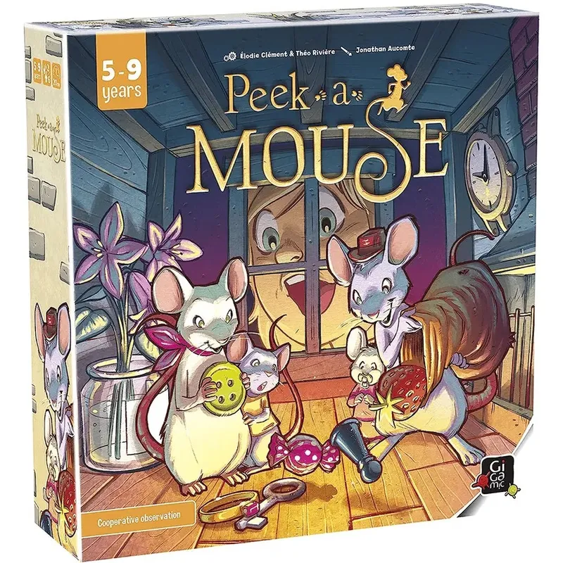 Peek a Mouse je društveno-edukativna kooperativna igra posmatranja i pamćenja namenjena uzrastu od 5 do 9 godina. Igra se odvija unutar same kutije, koja se pretvara u živopisnu mišju kućicu podeljenu na četiri prostorije. Početak partije izgleda vrlo jednostavno: kroz otvor na krovu ubacuju se drveni tokeni sa ilustracijama predmeta. Kućica se zatim dobro protrese, a igrači imaju svega 30 sekundi da zapamte gde se koji predmet nalazi.